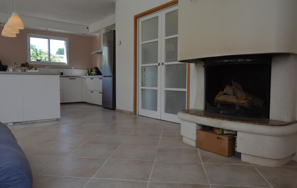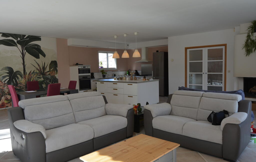 Composée d'une cuisine équipée : combiné four micro-onde, lave-vaisselle, plaque gaz, hotte, ouverte sur séjour salon avec cheminée, foyer fermé.