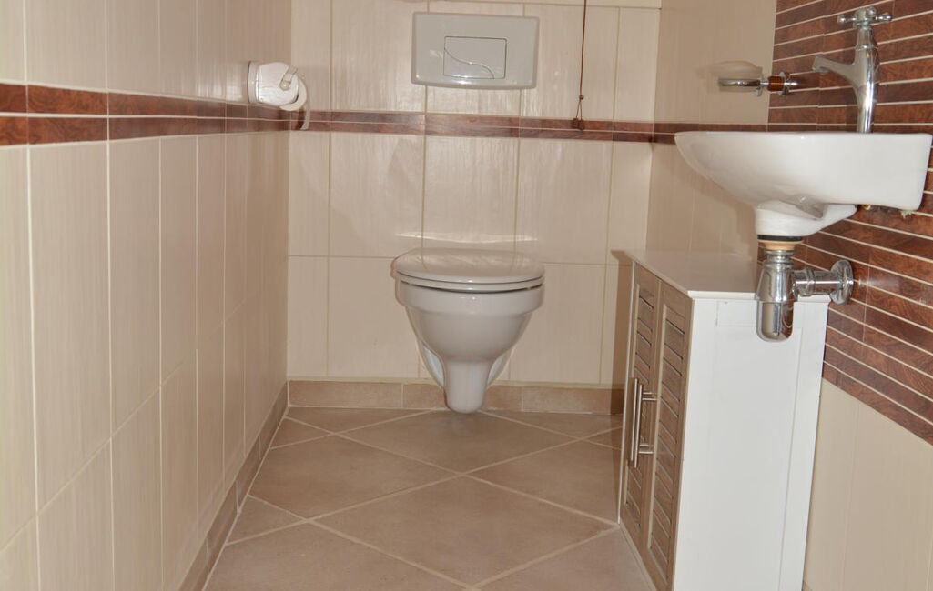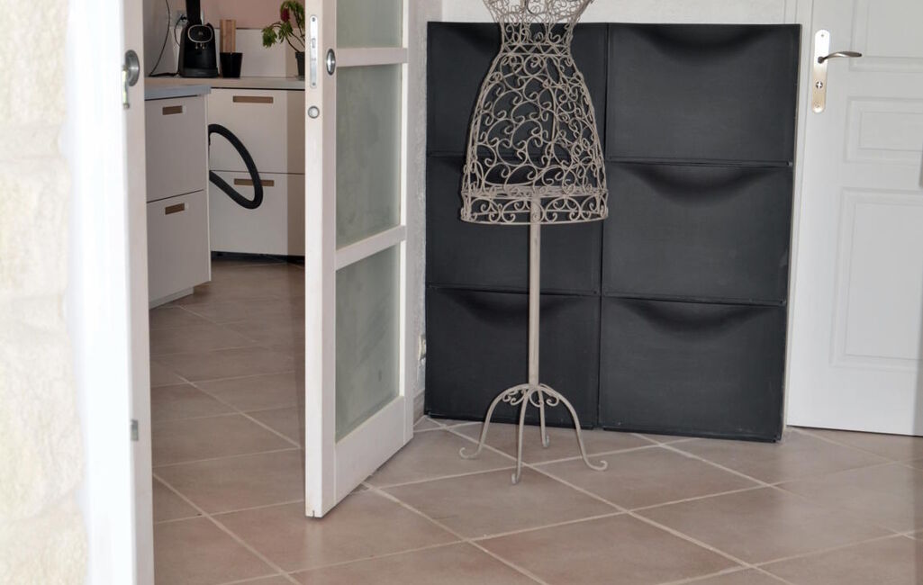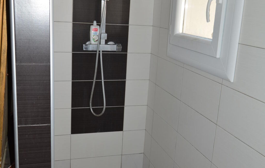 Petit abri, jardin, récupérateur eau de pluie, terrasse carrelée.