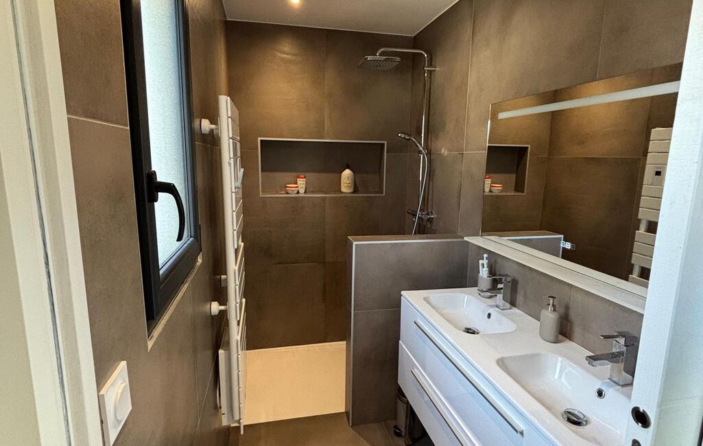 Suite parentale 19 m²+dressing+salle d'eau équipée, double vasque, douche italienne, radiateur séchant.