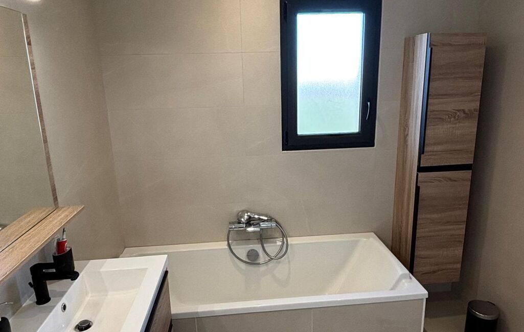 1 Salle de bains : équipée double vasques. Baignoire, douche italienne.