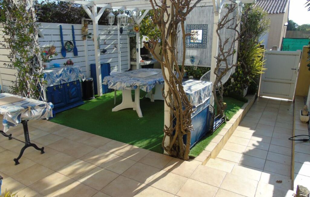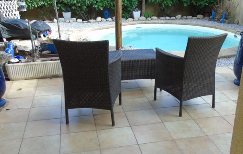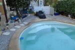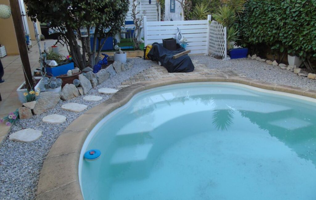 Avec sa pergola, pour une intimité préservée, et sa jolie piscine en forme de coquillage.
